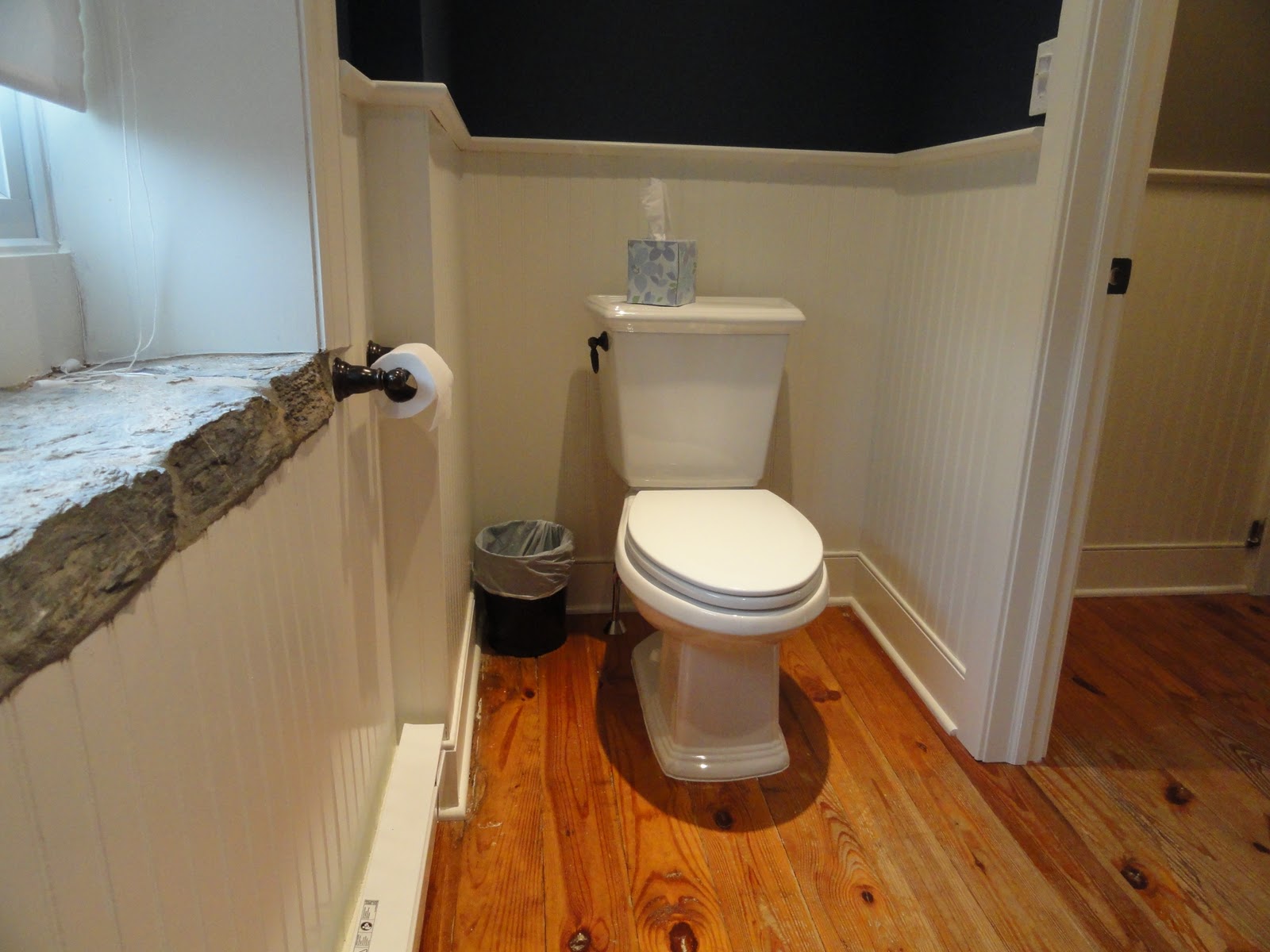 Winter Renovations Unvealed 4Drum Roll… the BEST Winter project is… !?!?  On the first floor, also off the hallway that leads to Guest Room #1, was an old storage room.  This cluttered, junky, generally yucky space has been transformed into a cloak-room / hallway that leads to… TWO new powder rooms!!  Everything about this space is wonderful:  the paint color is warm, the old wood floors shine, the wainscoting is in keeping with the property’s history and makes the old stone window ledges ‘pop’.