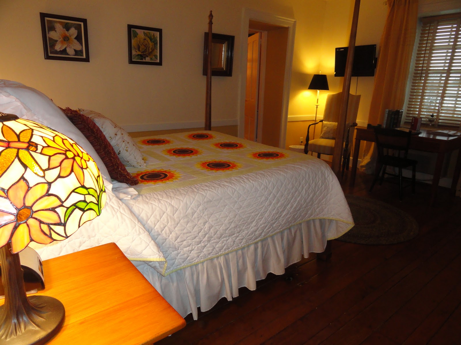 Guest Room #2 – the Yellow Room:  This cheerful, charming guest room suffered from numerous of cracks in the plaster ceiling and outdated, curtains.  All the cracks were repaired and the walls and ceiling were painted in a combination of yellow tones.  The updated curtains are semi-custom with ‘off the shelf’ panels on top and a strip of floral linen on the bottom, allowing the curtains to just ‘kiss’ the floor.  Extra fabric became accent pillows for the bed and chair.  Two paintings by local artist Gladys ?? where purchased from the HeArt of Friendship art gallery in Downtown Ephrata.  And finally, a new Tiffany style lamp compliments the sunflower designed hand-sewn quilt while brightening things up nicely.