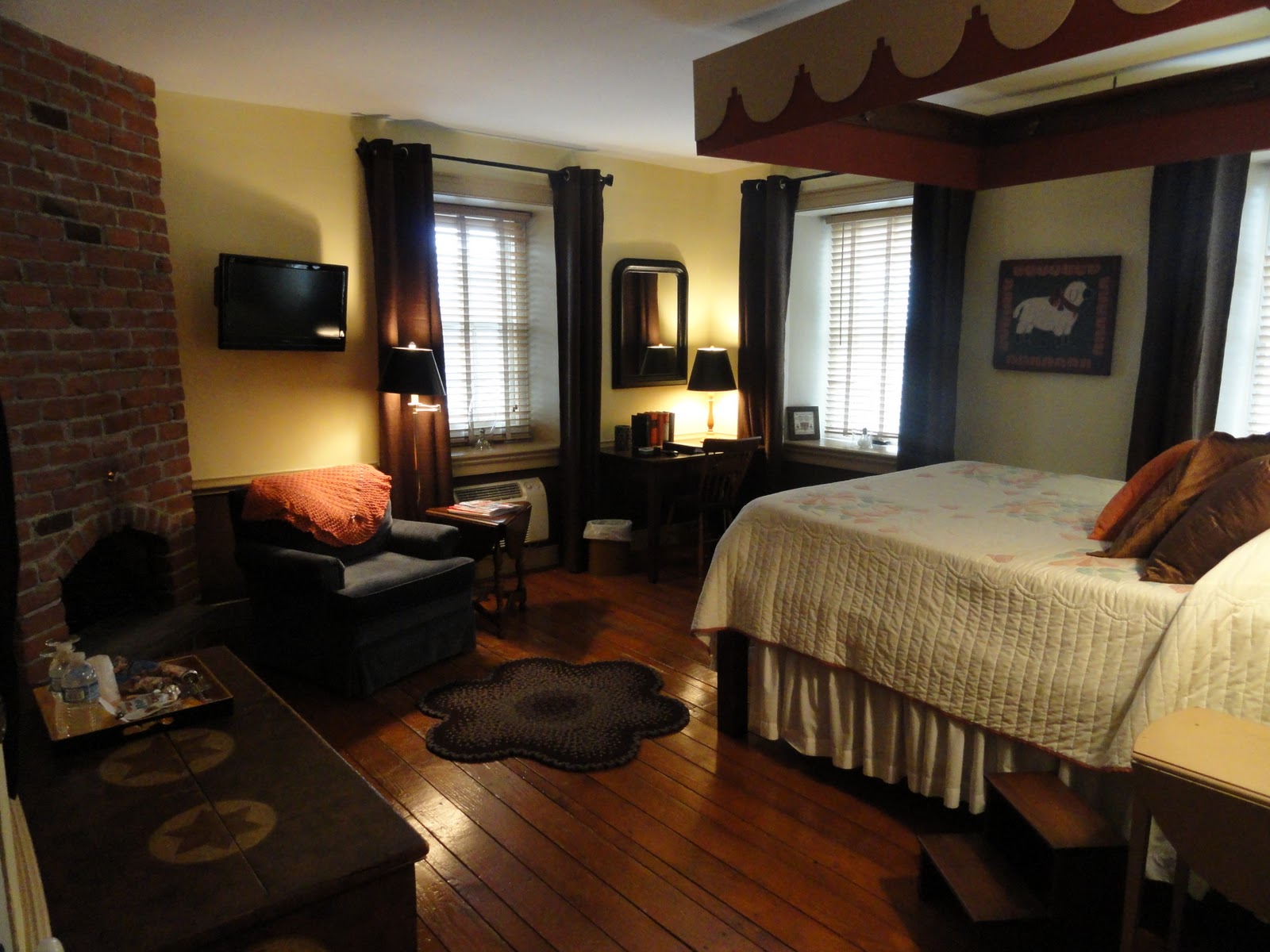 Guestroom #3 – the Chocolate Room:  A fresh coat of paint and new curtains warmed up the feel of this room.  It was always a favorite choice, especially among male guests who love the strong canopy bed and the bare brick fireplace, but now it’s spruced up and lovely.  A new desk and night stand were purchased from local nearby Adamstown antique shops.  A new focal point in the room is a hooked rug that hangs between the front windows.  It looks great and is a reminder of a ‘regular’ guest of the Historic Smithton Inn who made it especially for the Inn (thanks Karen!!!).